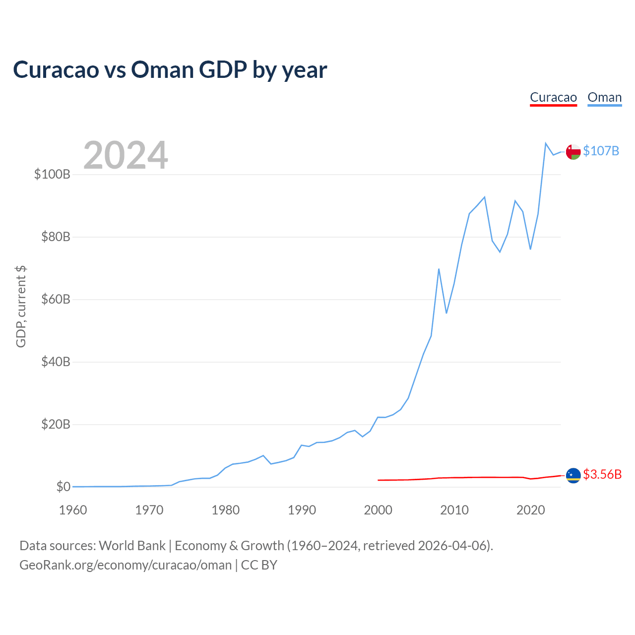 Curacao has a GDP of $3.56B compared to $107B for Oman, ranking 167/197 and 70/197 by economy size, respectively.