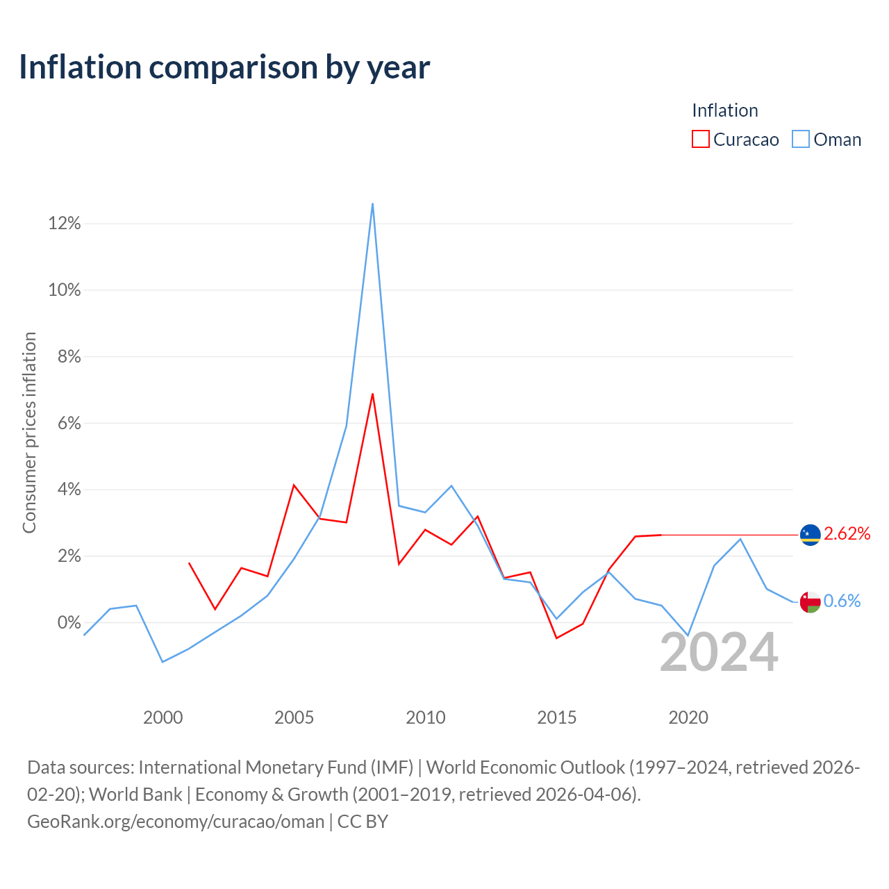 Over the past 19 years, Curacao has recorded an average annual inflation rate of 2.18%, compared with 2.29% in Oman. In 2019, inflation was 2.62% in Curacao and 0.6% in Oman.