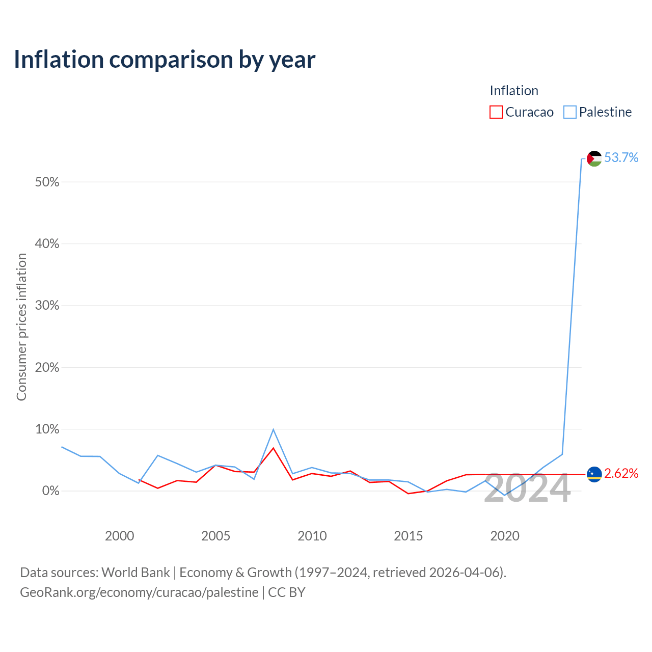 Over the past 19 years, Curacao has recorded an average annual inflation rate of 2.18%, compared with 2.76% in Palestine. In 2019, inflation was 2.62% in Curacao and 53.7% in Palestine.