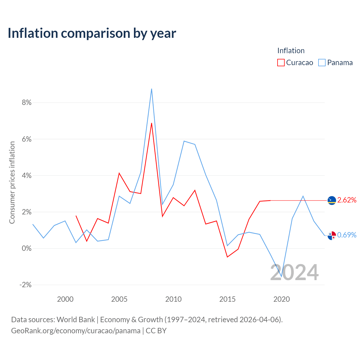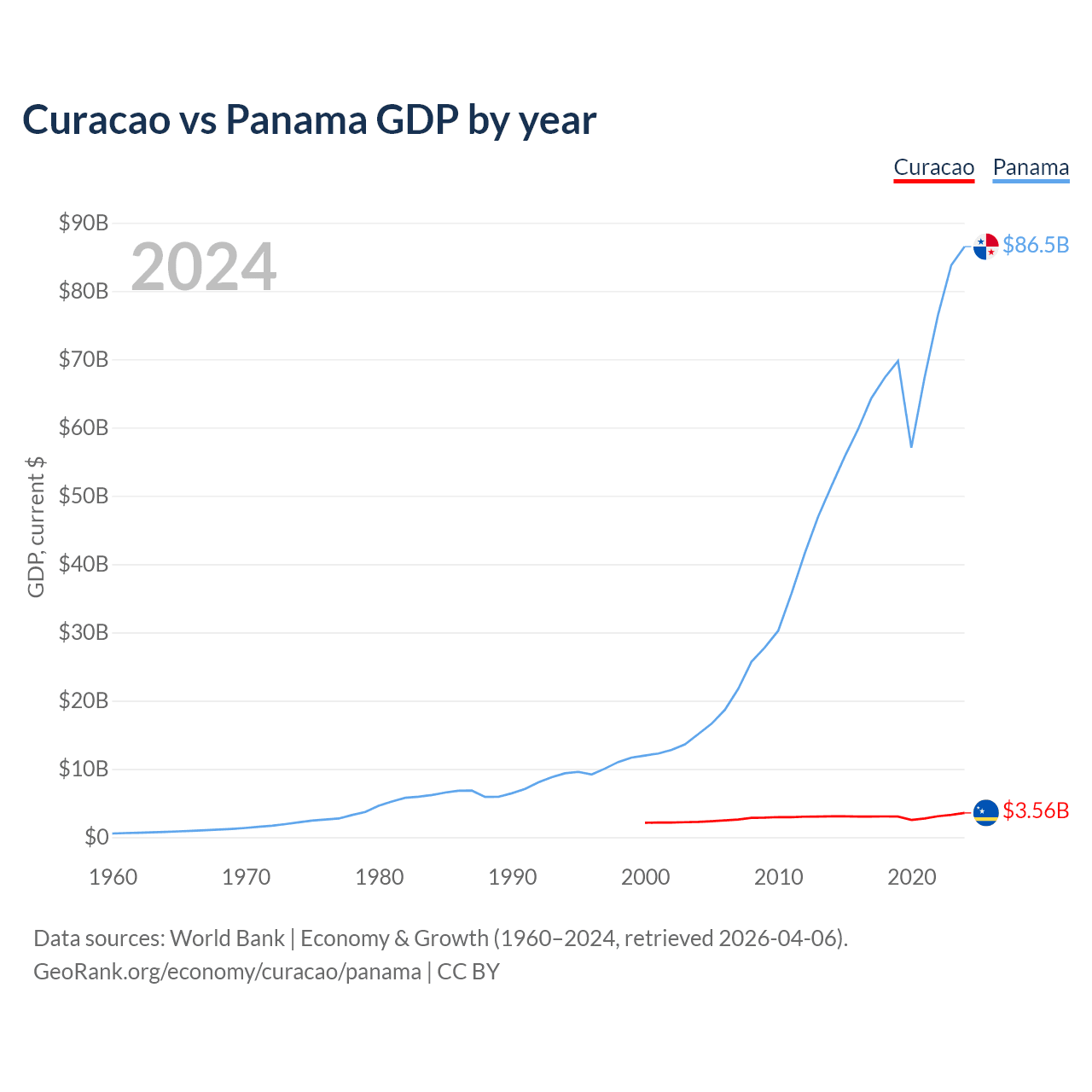 Curacao has a GDP of $3.56B compared to $86.5B for Panama, ranking 167/197 and 78/197 by economy size, respectively.