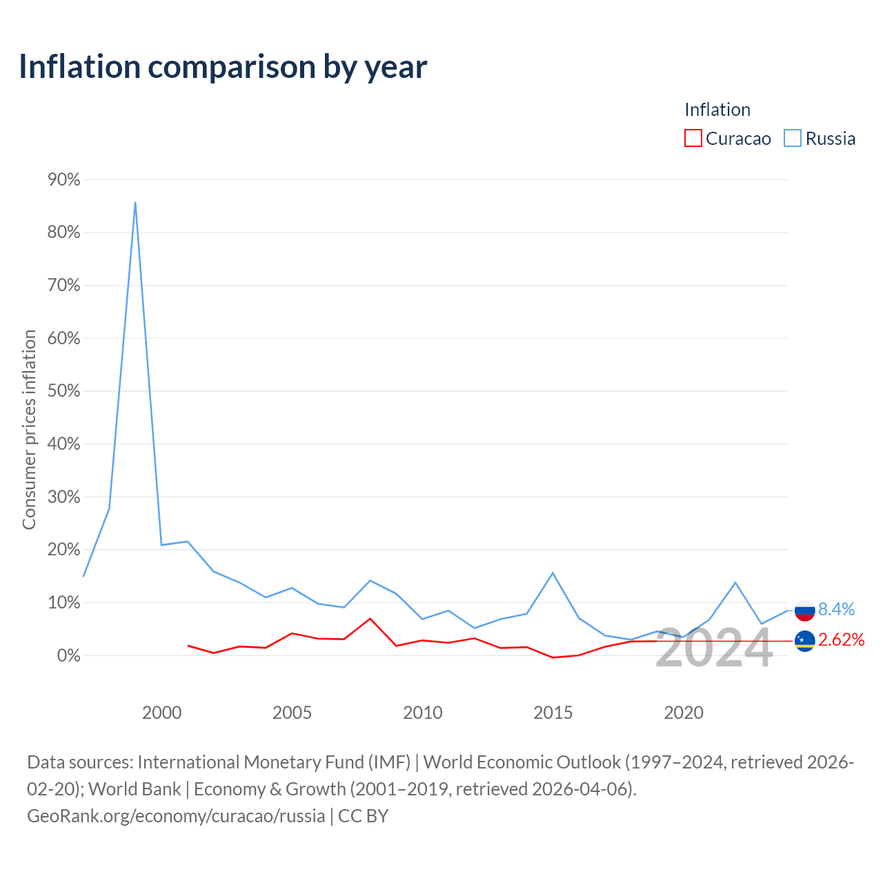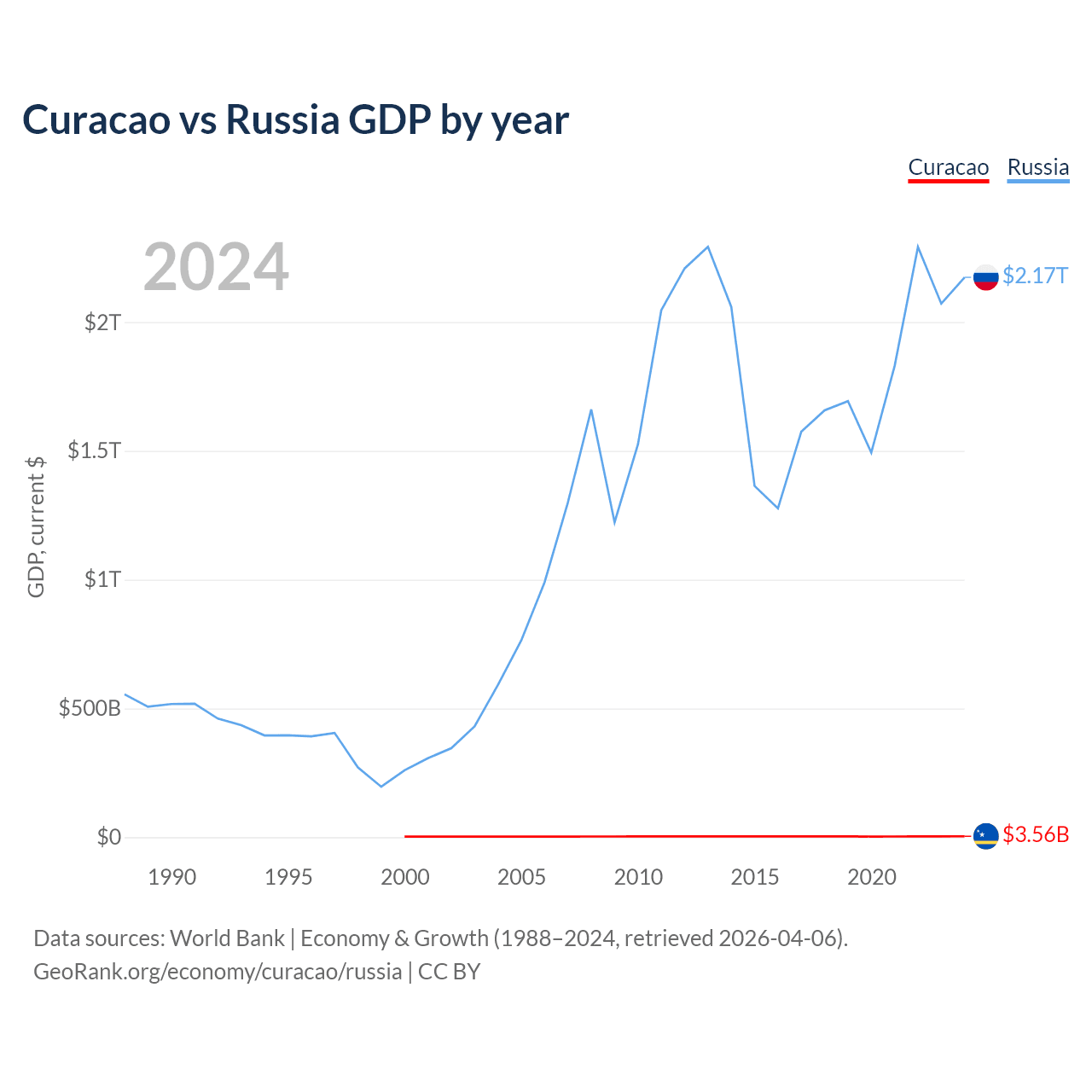 Curacao has a GDP of $3.56B compared to $2.17T for Russia, ranking 167/197 and 11/197 by economy size, respectively.