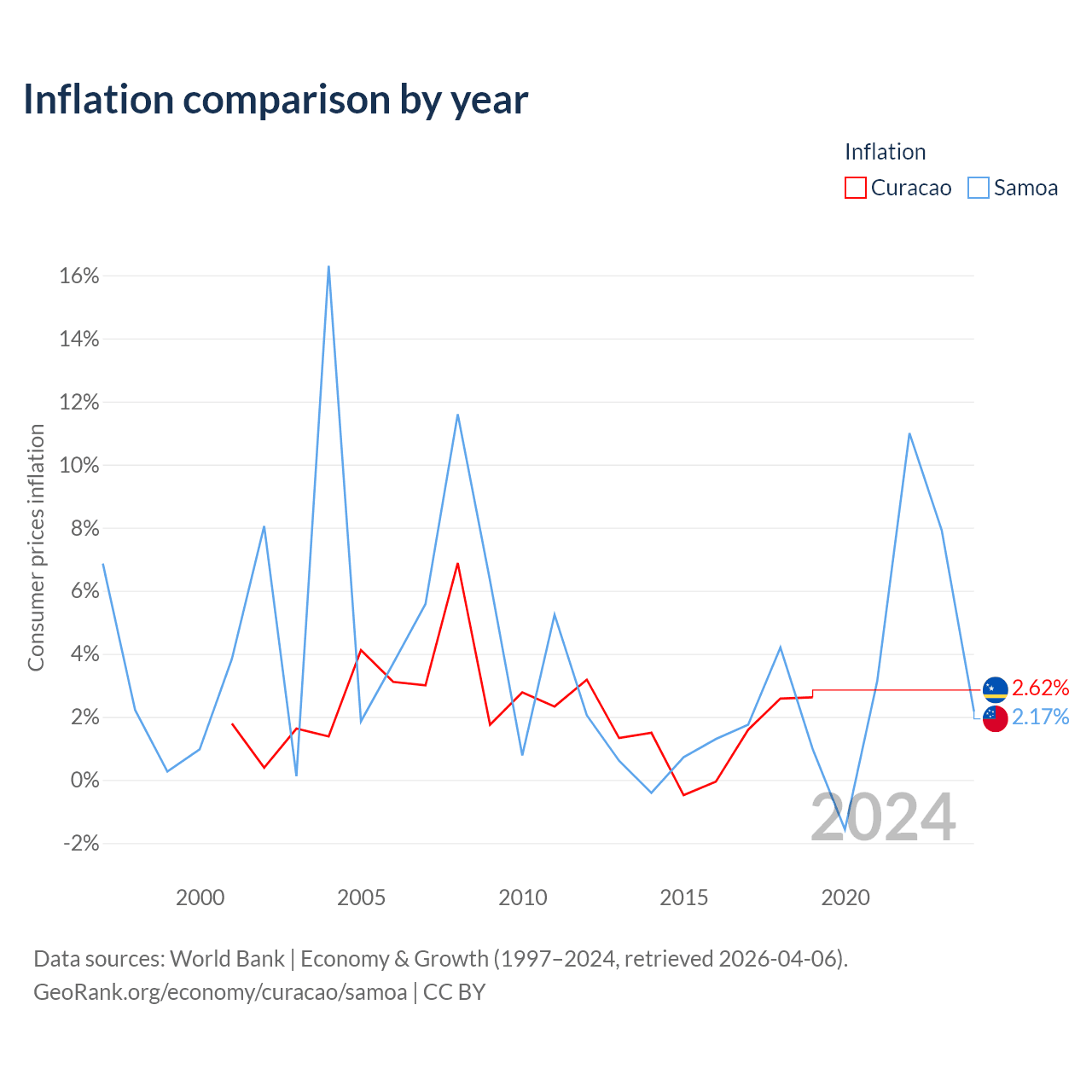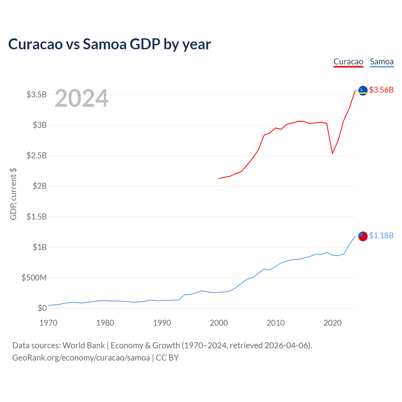 Curacao has a GDP of $3.56B compared to $1.18B for Samoa, ranking 167/197 and 185/197 by economy size, respectively.