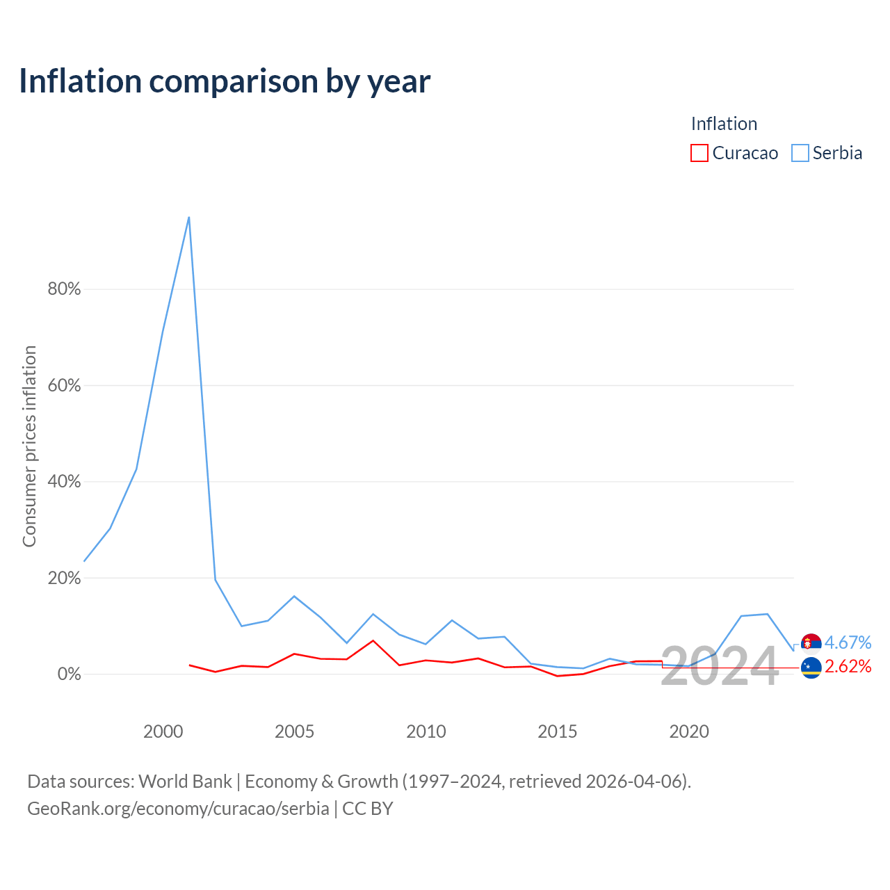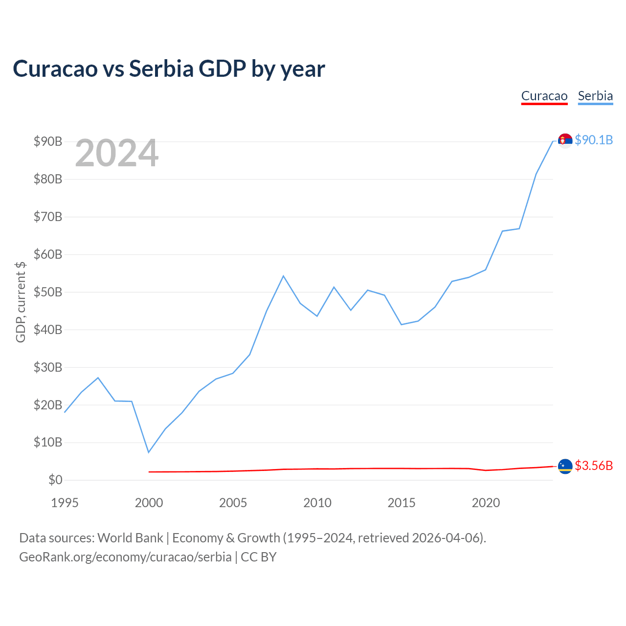 Curacao has a GDP of $3.56B compared to $90.1B for Serbia, ranking 167/197 and 76/197 by economy size, respectively.