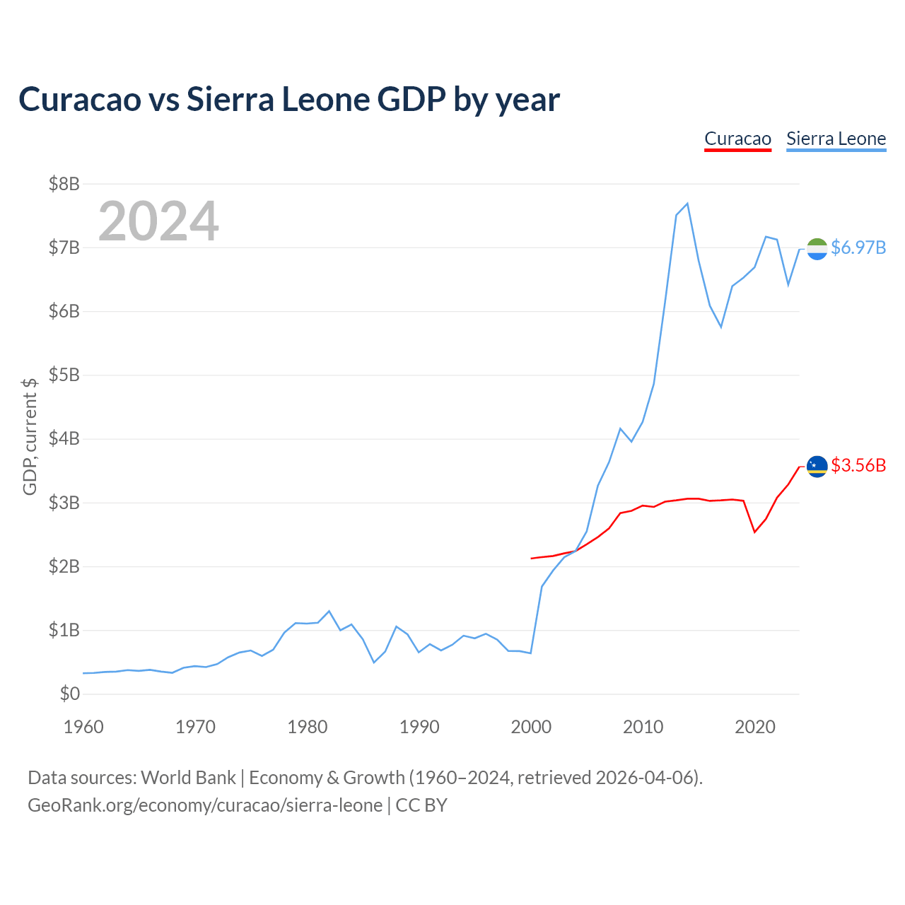 Curacao has a GDP of $3.56B compared to $6.97B for Sierra Leone, ranking 167/197 and 160/197 by economy size, respectively.