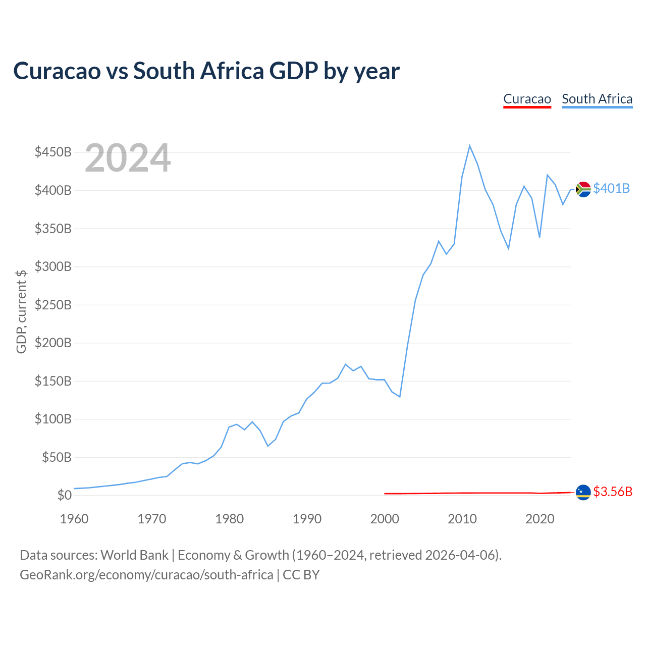 Curacao has a GDP of $3.56B compared to $401B for South Africa, ranking 167/197 and 40/197 by economy size, respectively.