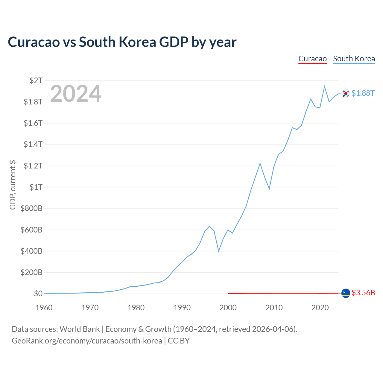 Curacao has a GDP of $3.56B compared to $1.88T for South Korea, ranking 167/197 and 12/197 by economy size, respectively.