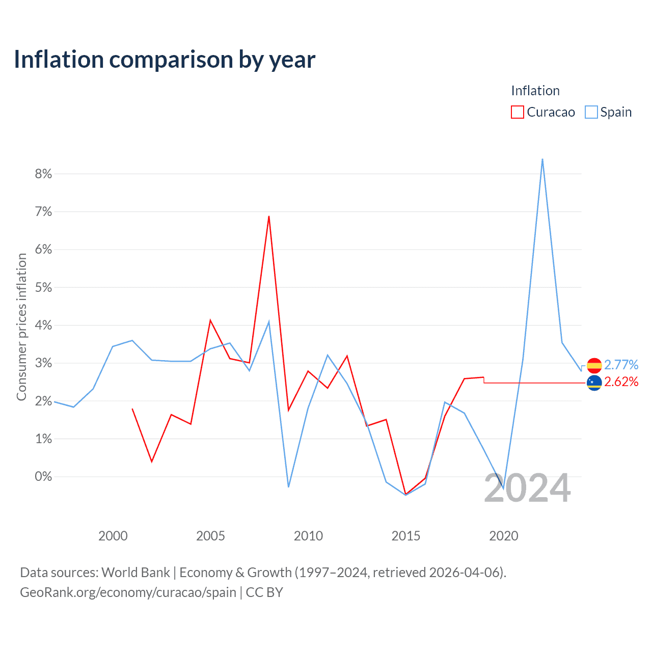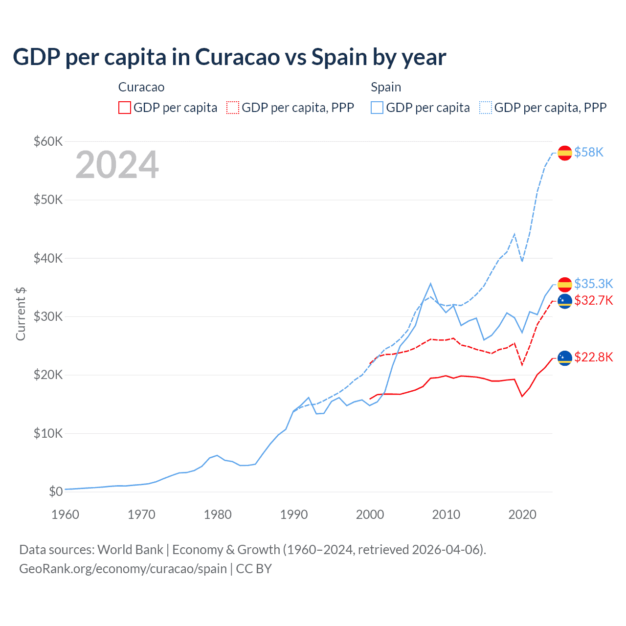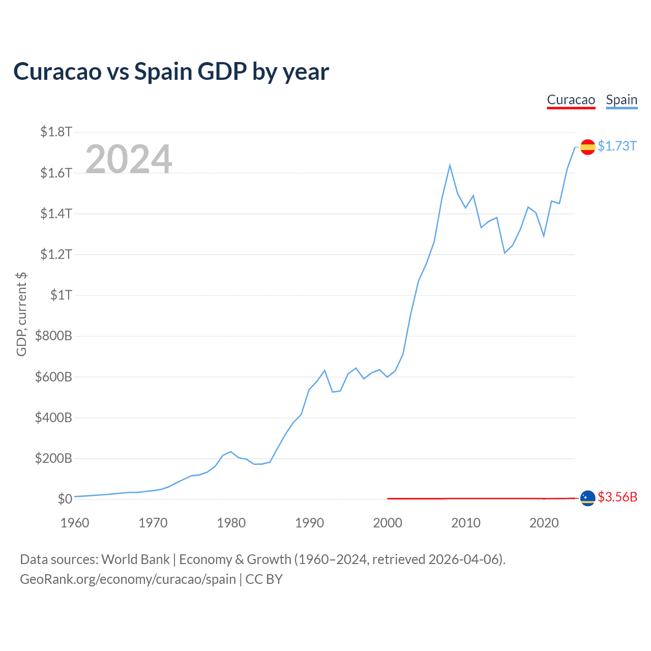Curacao has a GDP of $3.56B compared to $1.73T for Spain, ranking 167/197 and 15/197 by economy size, respectively.