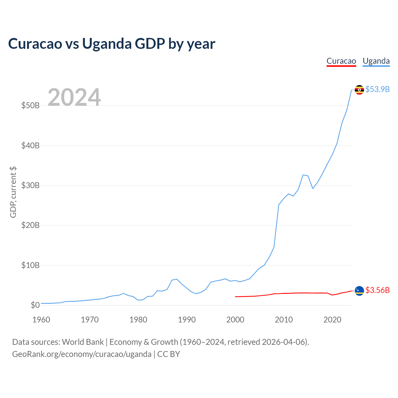 Curacao vs Uganda GDP by year