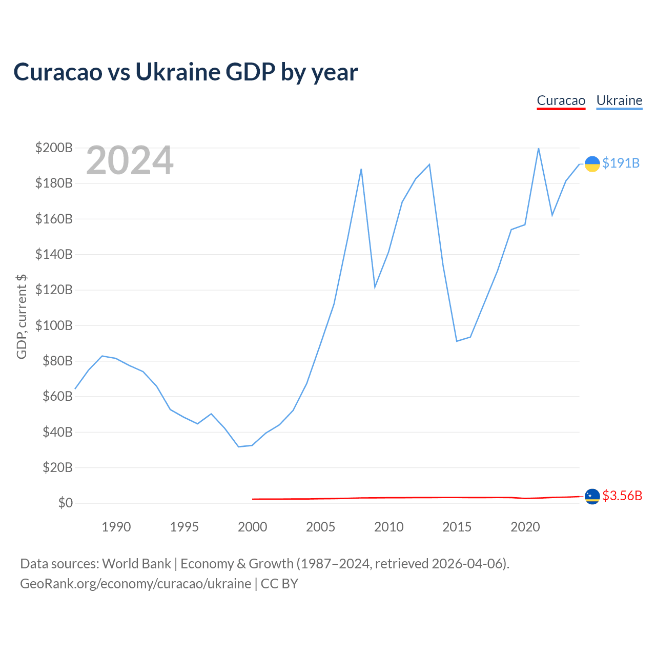 Curacao has a GDP of $3.56B compared to $191B for Ukraine, ranking 167/197 and 57/197 by economy size, respectively.