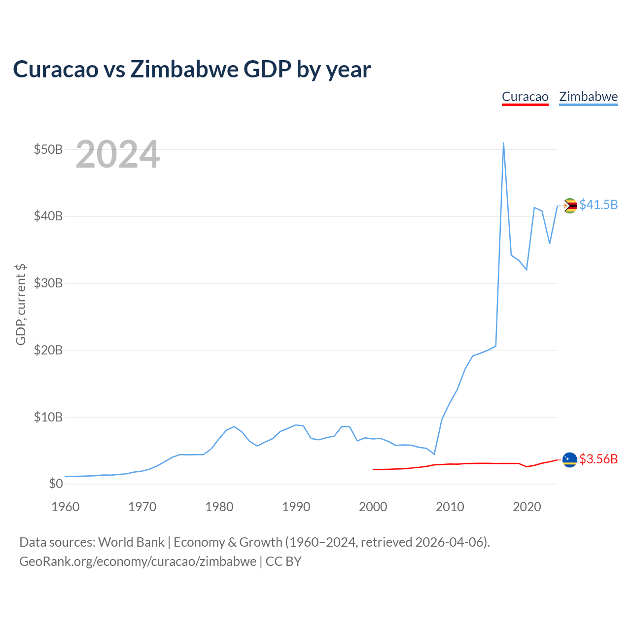 Curacao has a GDP of $3.56B compared to $41.5B for Zimbabwe, ranking 167/197 and 102/197 by economy size, respectively.