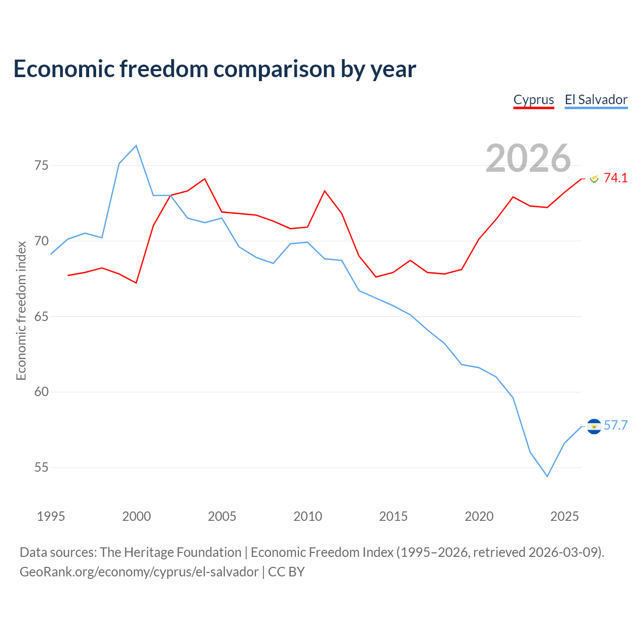 The Economic Freedom Index for Cyprus is 74.1, ranking 21/197, compared to 57.7 for El Salvador, ranking 114/197. The chart above displays a comparison of annual changes in economic freedom indexes.
