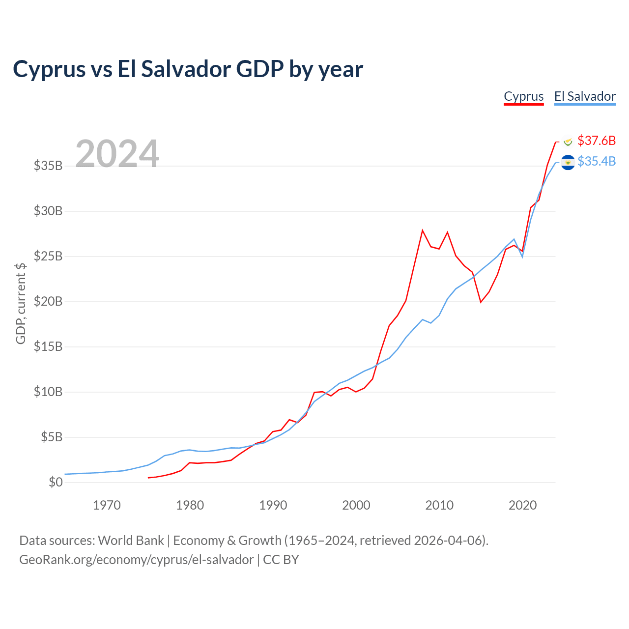 Cyprus has a GDP of $37.6B compared to $35.4B for El Salvador, ranking 103/197 and 105/197 by economy size, respectively.