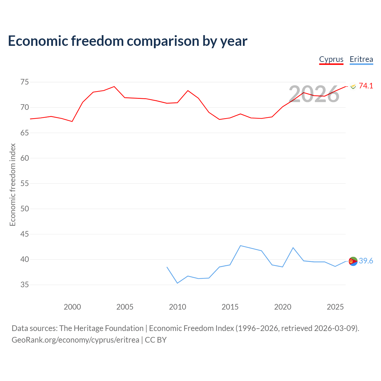 The Economic Freedom Index for Cyprus is 74.1, ranking 21/197, compared to 39.6 for Eritrea, ranking 188/197. The chart above displays a comparison of annual changes in economic freedom indexes.