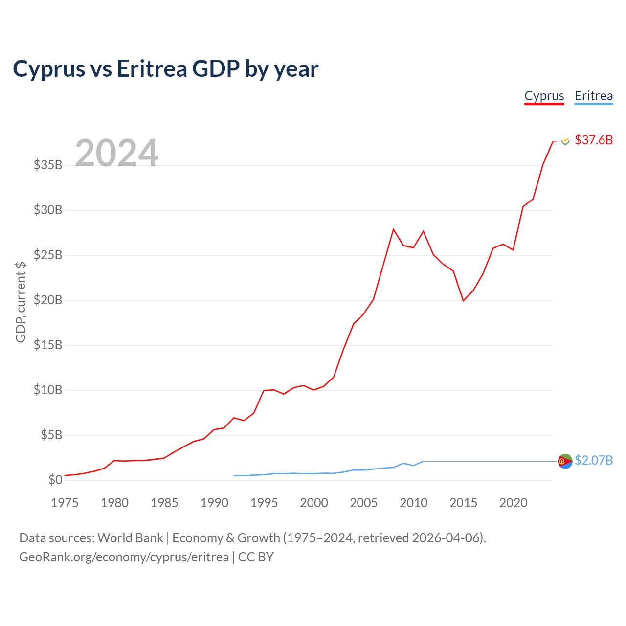 Cyprus has a GDP of $37.6B compared to $2.07B for Eritrea, ranking 103/197 and 179/197 by economy size, respectively.