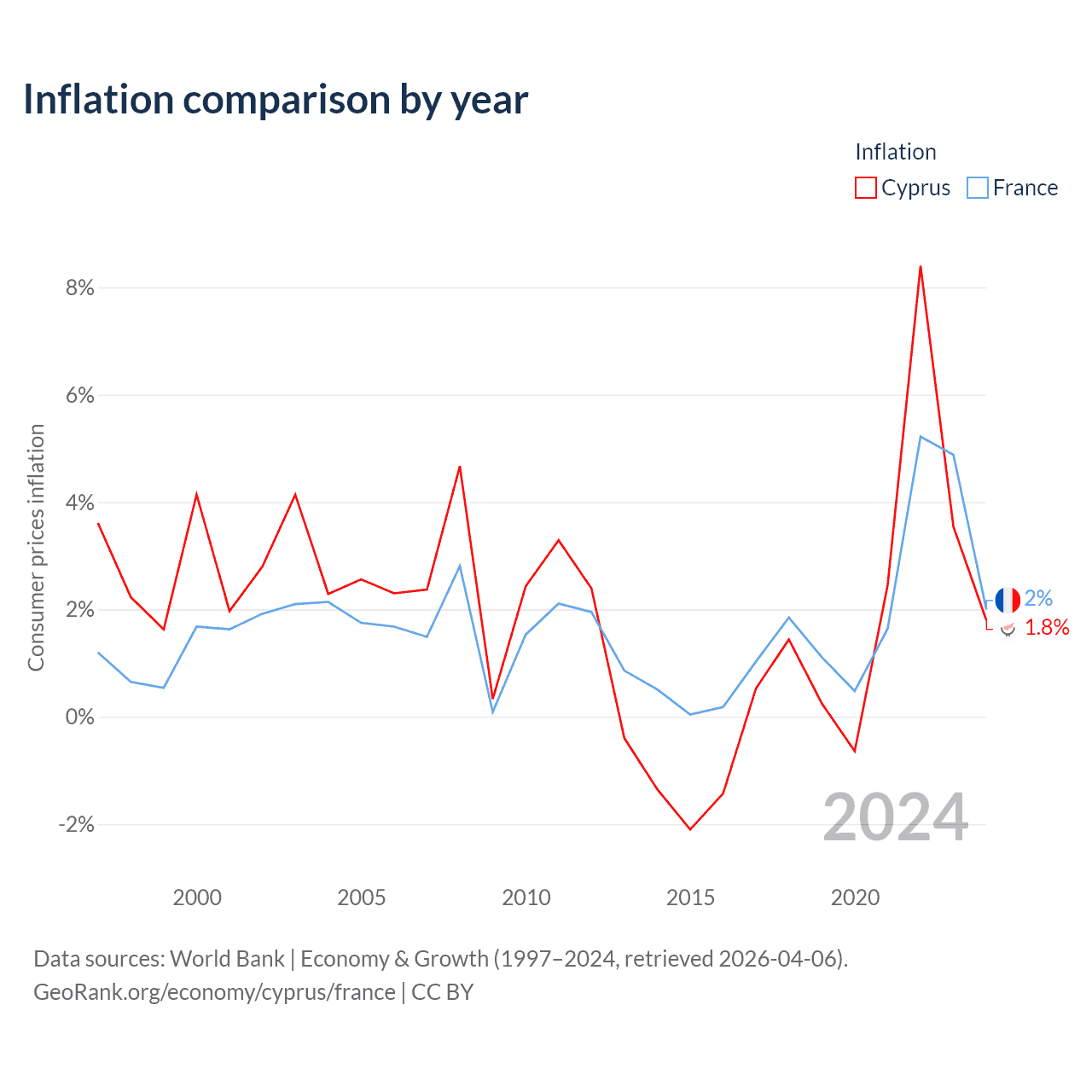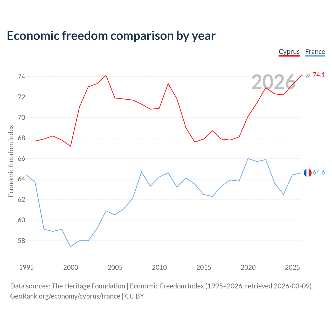 The Economic Freedom Index for Cyprus is 74.1, ranking 21/197, compared to 64.6 for France, ranking 72/197. The chart above displays a comparison of annual changes in economic freedom indexes.