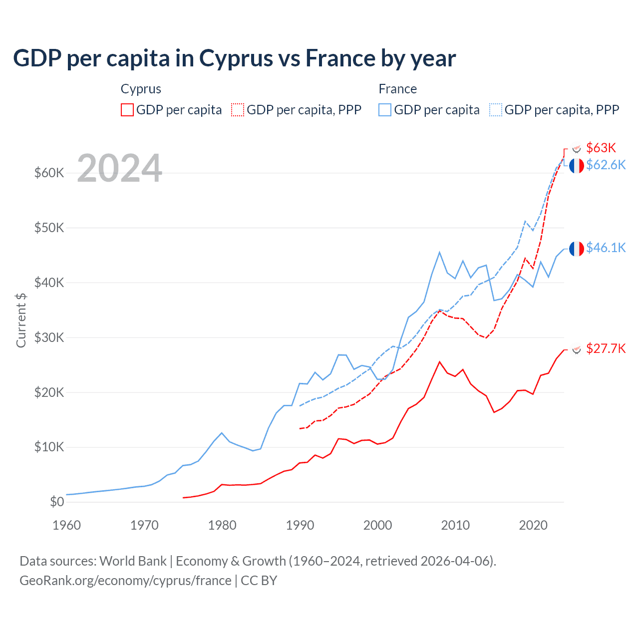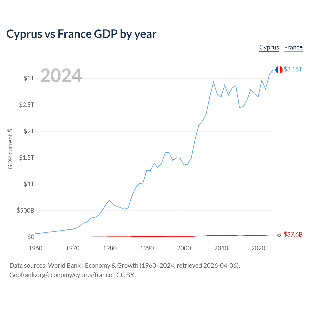 Cyprus has a GDP of $37.6B compared to $3.16T for France, ranking 103/197 and 7/197 by economy size, respectively.