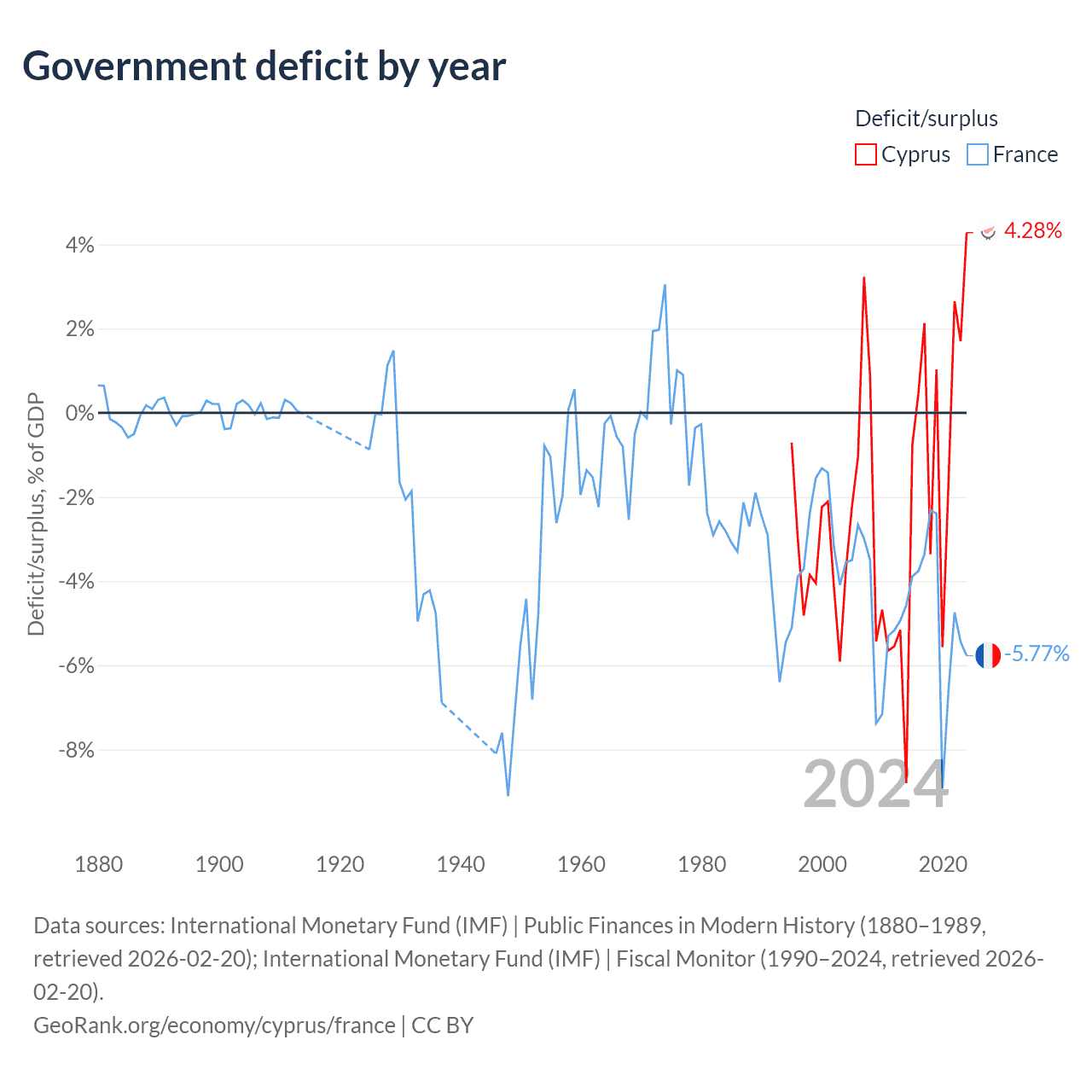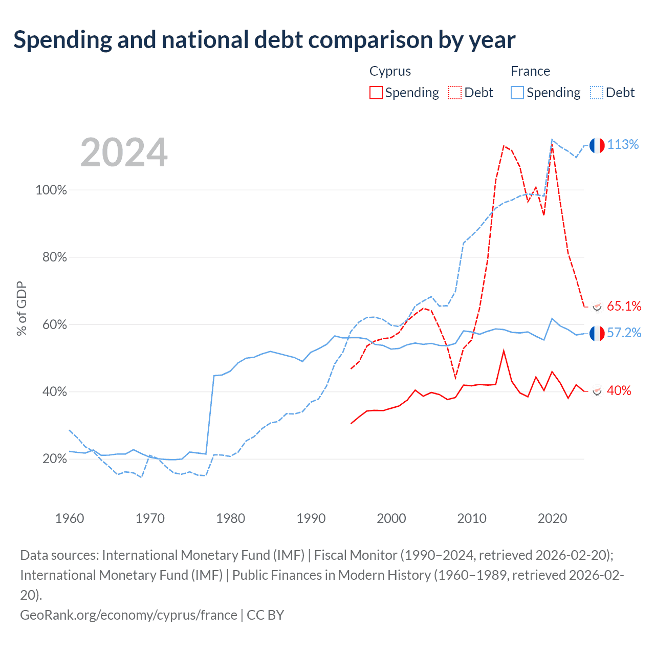 Cyprus has $24.5B in government debt (65.1% of GDP), compared to $3.58T (113.1% of GDP) in France.