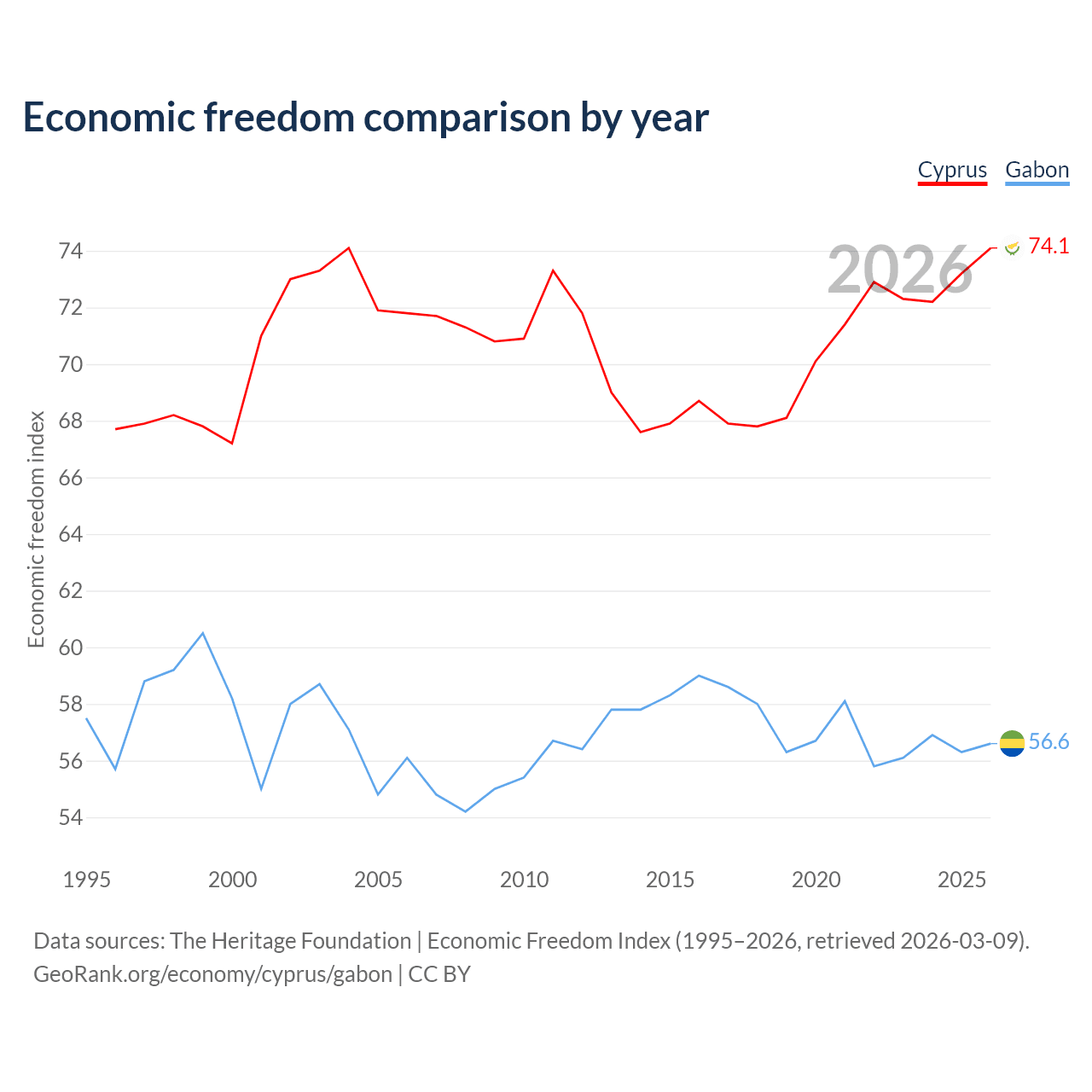 The Economic Freedom Index for Cyprus is 74.1, ranking 21/197, compared to 56.6 for Gabon, ranking 120/197. The chart above displays a comparison of annual changes in economic freedom indexes.
