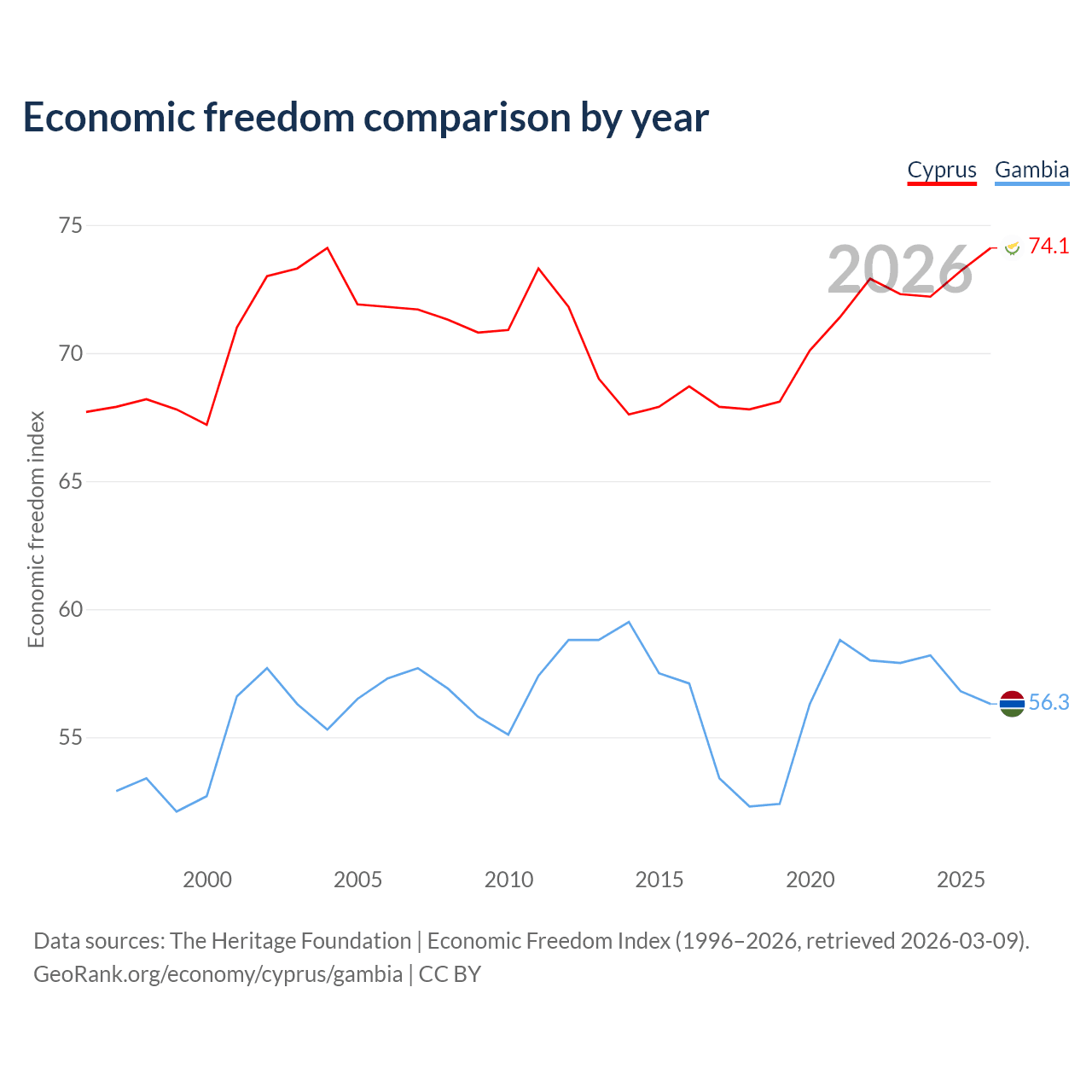 The Economic Freedom Index for Cyprus is 74.1, ranking 21/197, compared to 56.3 for the Gambia, ranking 123/197. The chart above displays a comparison of annual changes in economic freedom indexes.
