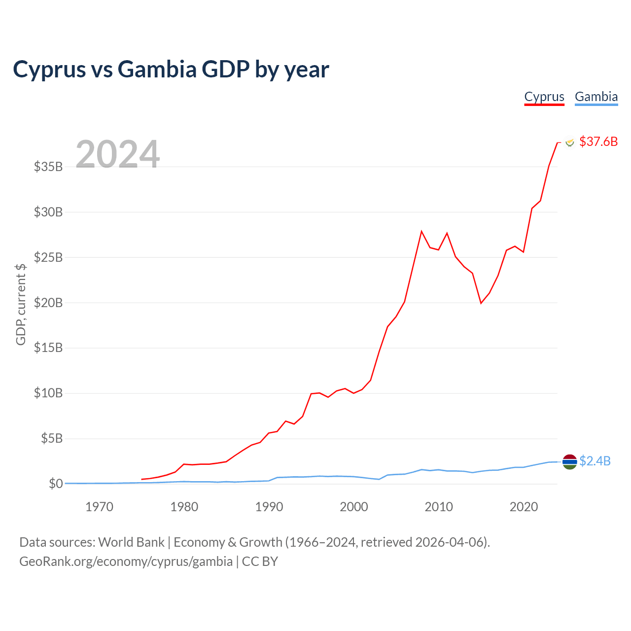 Cyprus has a GDP of $37.6B compared to $2.4B for the Gambia, ranking 103/197 and 174/197 by economy size, respectively.