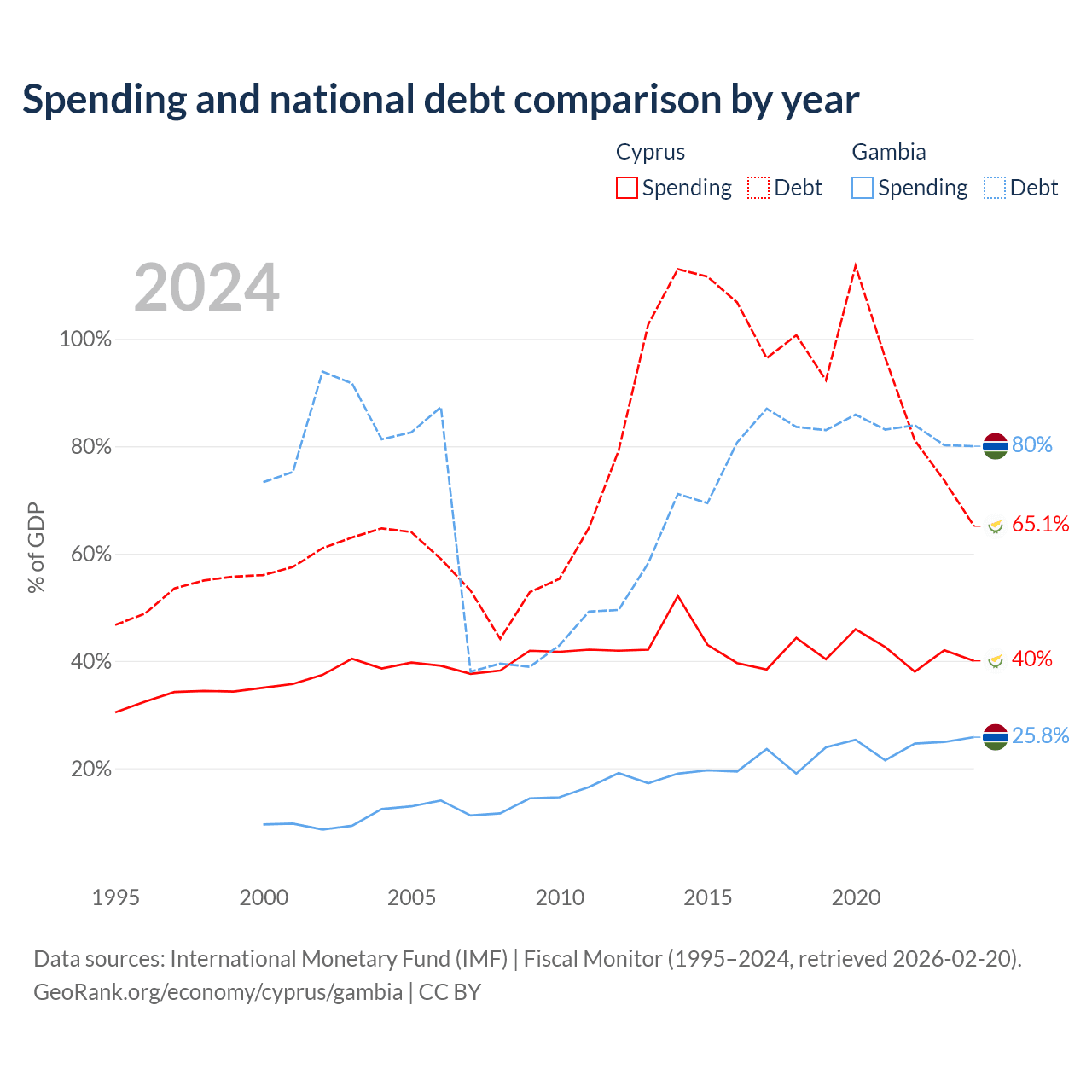 Cyprus has $24.5B in government debt (65.1% of GDP), compared to $1.92B (80% of GDP) in the Gambia.
