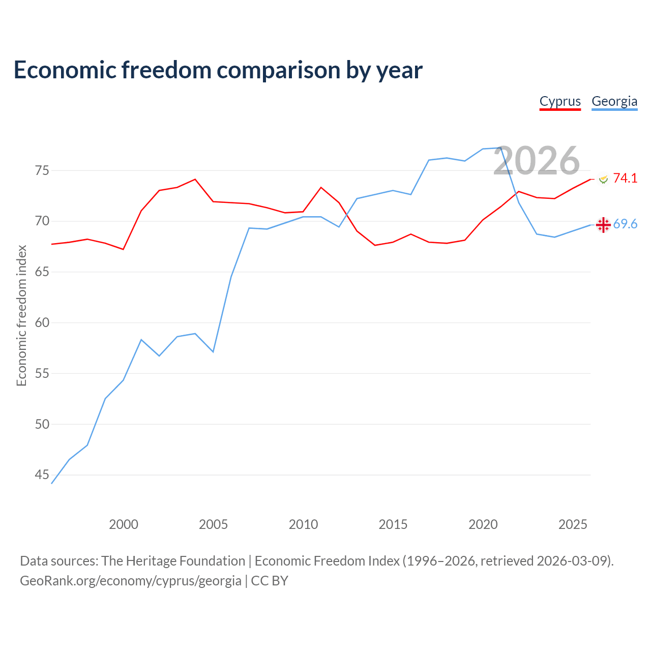 The Economic Freedom Index for Cyprus is 74.1, ranking 21/197, compared to 69.6 for Georgia, ranking 41/197. The chart above displays a comparison of annual changes in economic freedom indexes.