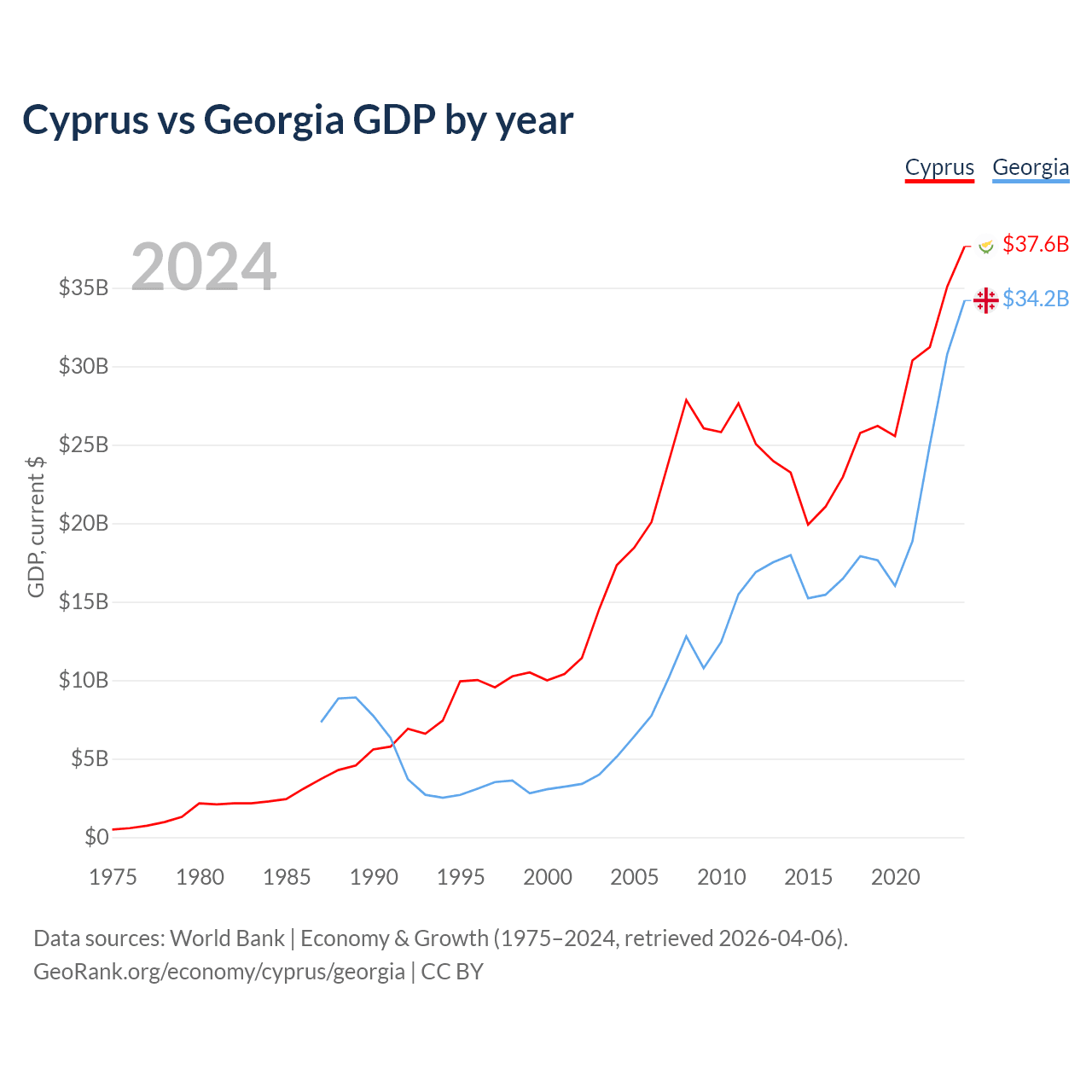Cyprus has a GDP of $37.6B compared to $34.2B for Georgia, ranking 103/197 and 107/197 by economy size, respectively.