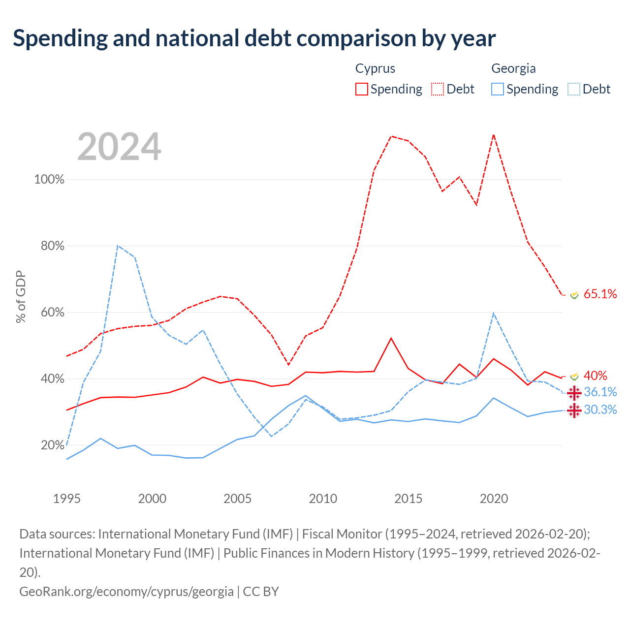 Cyprus has $24.5B in government debt (65.1% of GDP), compared to $12.3B (36.1% of GDP) in Georgia.