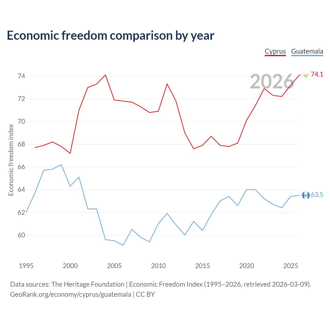 The Economic Freedom Index for Cyprus is 74.1, ranking 21/197, compared to 63.5 for Guatemala, ranking 79/197. The chart above displays a comparison of annual changes in economic freedom indexes.