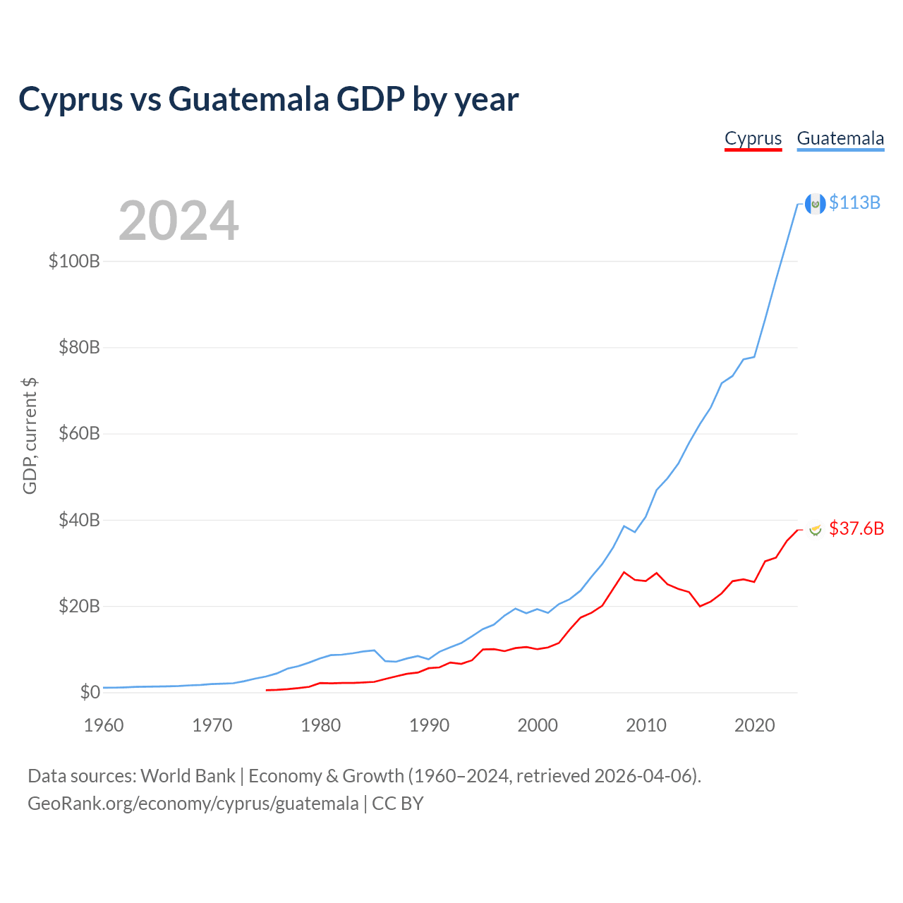 Cyprus has a GDP of $37.6B compared to $113B for Guatemala, ranking 103/197 and 68/197 by economy size, respectively.
