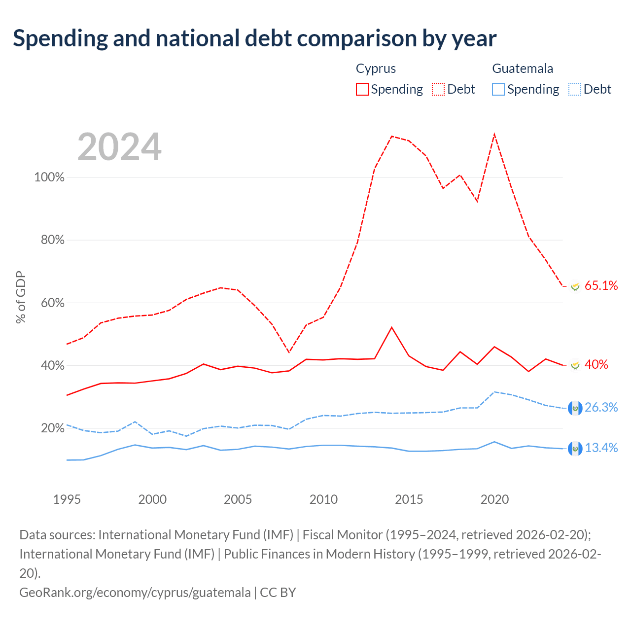 Cyprus has $24.5B in government debt (65.1% of GDP), compared to $29.8B (26.3% of GDP) in Guatemala.