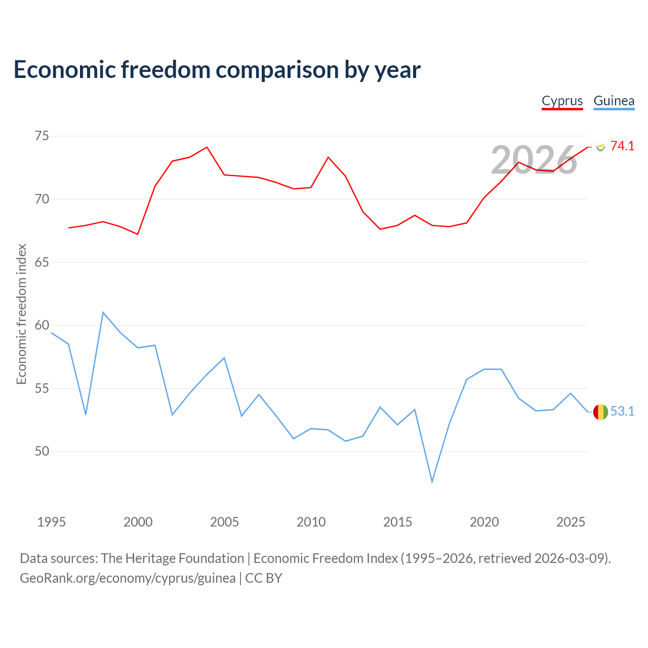The Economic Freedom Index for Cyprus is 74.1, ranking 21/197, compared to 53.1 for Guinea, ranking 141/197. The chart above displays a comparison of annual changes in economic freedom indexes.