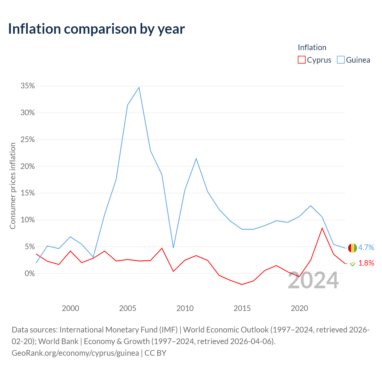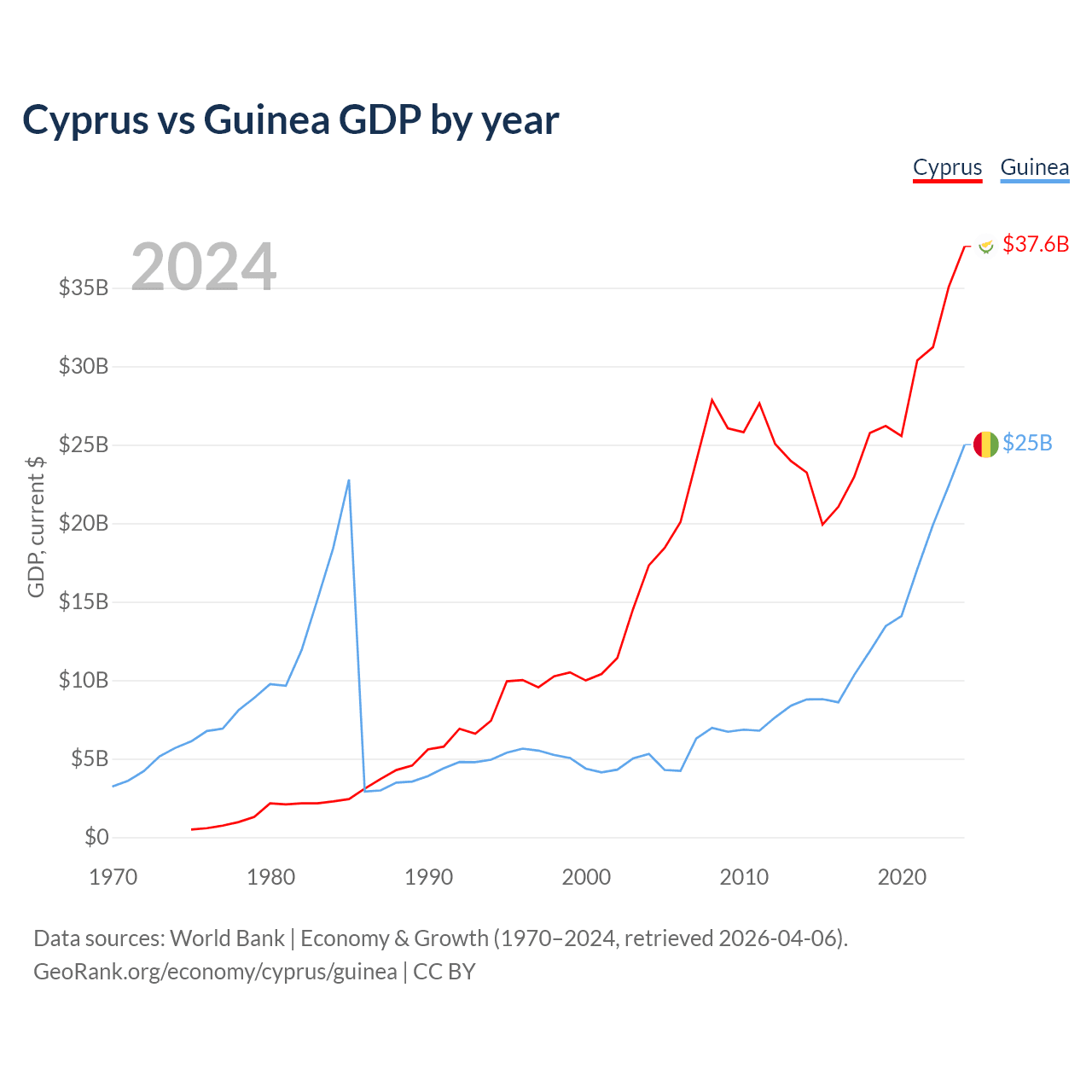 Cyprus has a GDP of $37.6B compared to $25B for Guinea, ranking 103/197 and 118/197 by economy size, respectively.