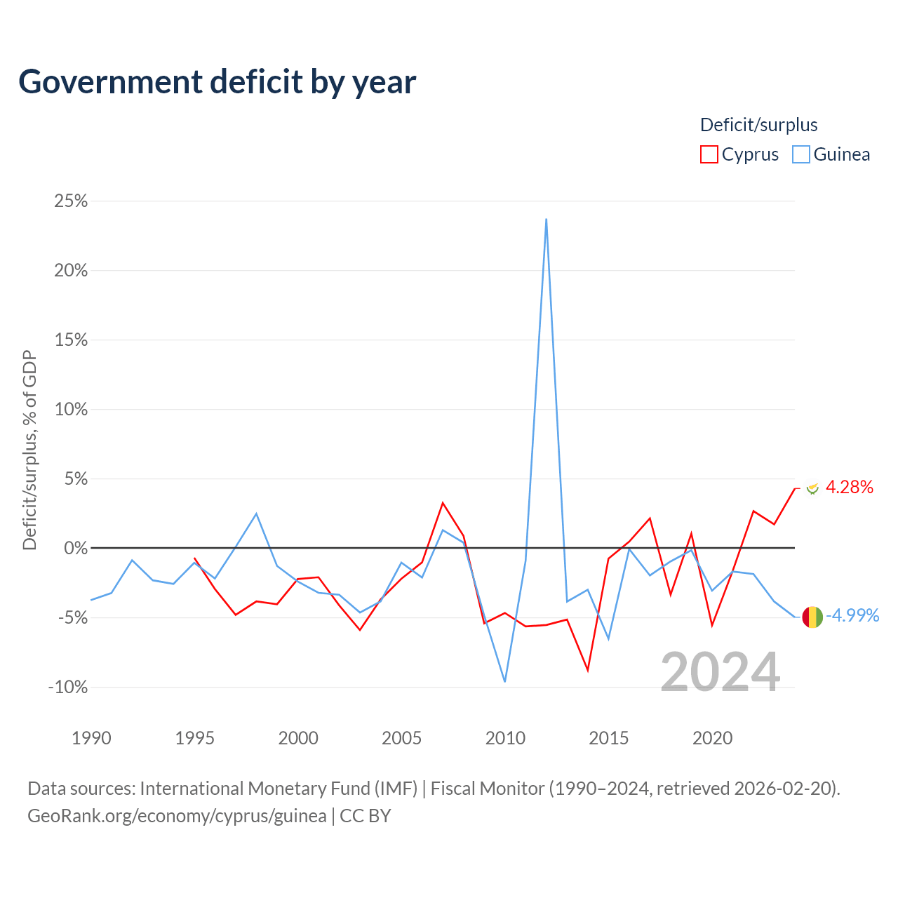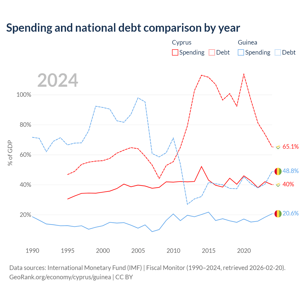 Cyprus has $24.5B in government debt (65.1% of GDP), compared to $12.2B (48.8% of GDP) in Guinea.