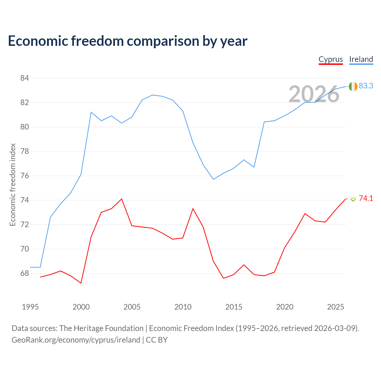 The Economic Freedom Index for Cyprus is 74.1, ranking 21/197, compared to 83.3 for Ireland, ranking 3/197. The chart above displays a comparison of annual changes in economic freedom indexes.