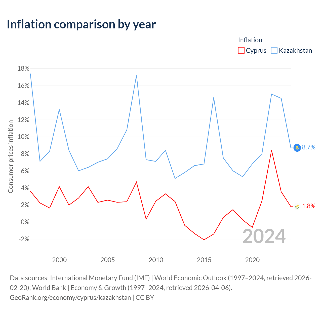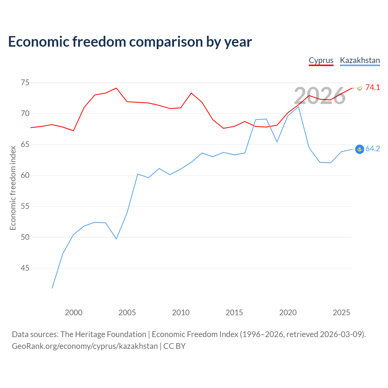 The Economic Freedom Index for Cyprus is 74.1, ranking 21/197, compared to 64.2 for Kazakhstan, ranking 75/197. The chart above displays a comparison of annual changes in economic freedom indexes.