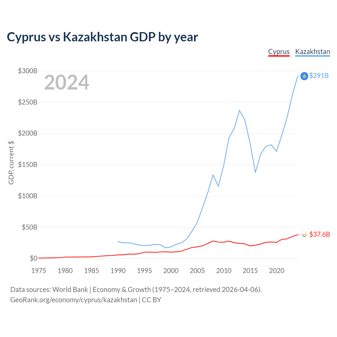 Cyprus has a GDP of $37.6B compared to $291B for Kazakhstan, ranking 103/197 and 48/197 by economy size, respectively.