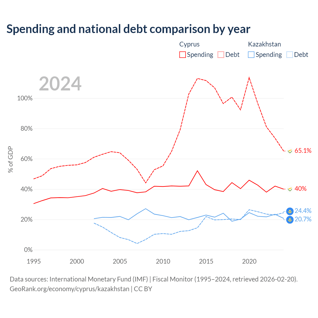 Cyprus has $24.5B in government debt (65.1% of GDP), compared to $71.1B (24.4% of GDP) in Kazakhstan.