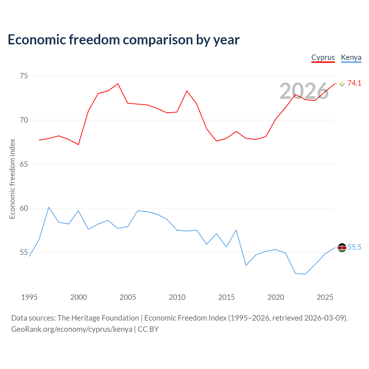 The Economic Freedom Index for Cyprus is 74.1, ranking 21/197, compared to 55.5 for Kenya, ranking 128/197. The chart above displays a comparison of annual changes in economic freedom indexes.