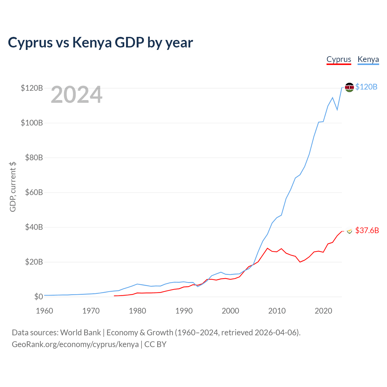 Cyprus has a GDP of $37.6B compared to $120B for Kenya, ranking 103/197 and 64/197 by economy size, respectively.