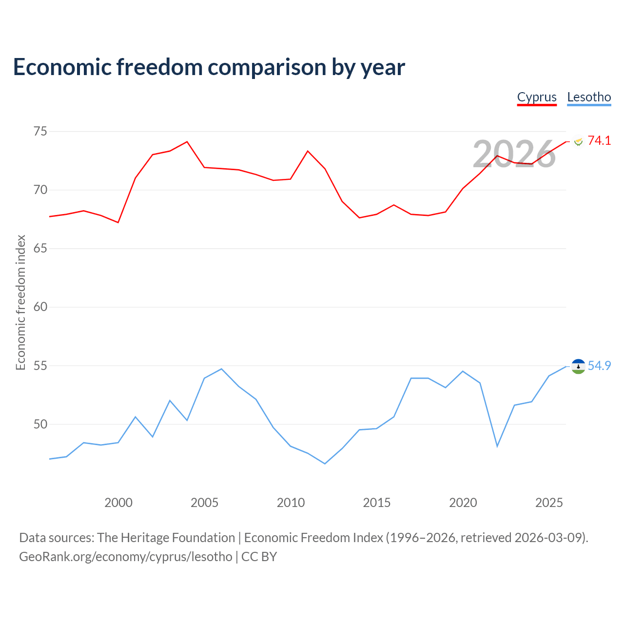 The Economic Freedom Index for Cyprus is 74.1, ranking 21/197, compared to 54.9 for Lesotho, ranking 130/197. The chart above displays a comparison of annual changes in economic freedom indexes.