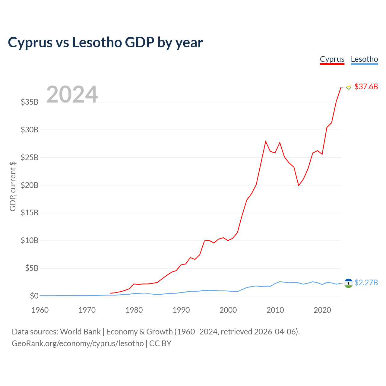 Cyprus has a GDP of $37.6B compared to $2.27B for Lesotho, ranking 103/197 and 175/197 by economy size, respectively.