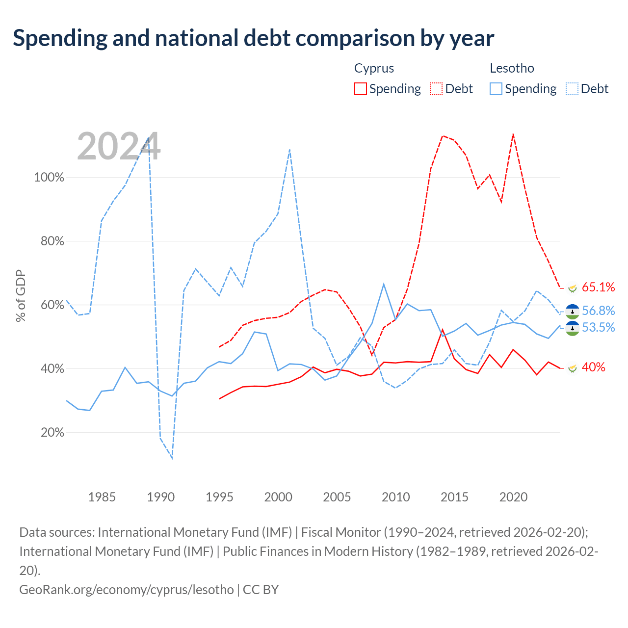 Cyprus has $24.5B in government debt (65.1% of GDP), compared to $1.29B (56.8% of GDP) in Lesotho.