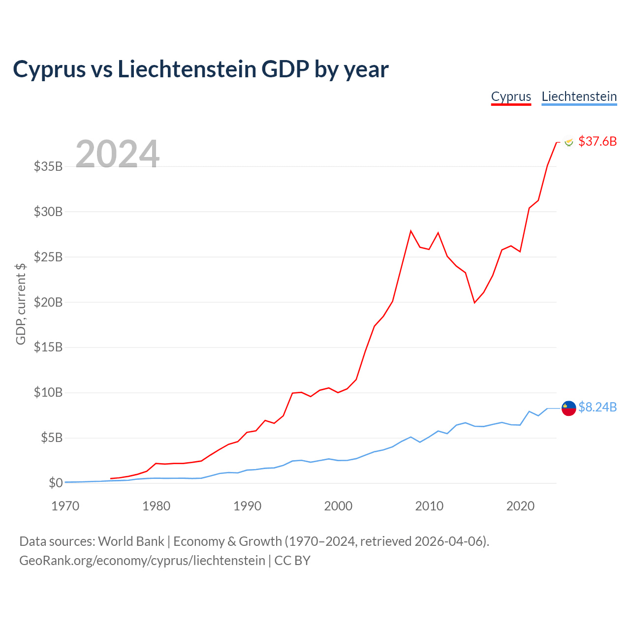 Cyprus has a GDP of $37.6B compared to $8.24B for Liechtenstein, ranking 103/197 and 156/197 by economy size, respectively.