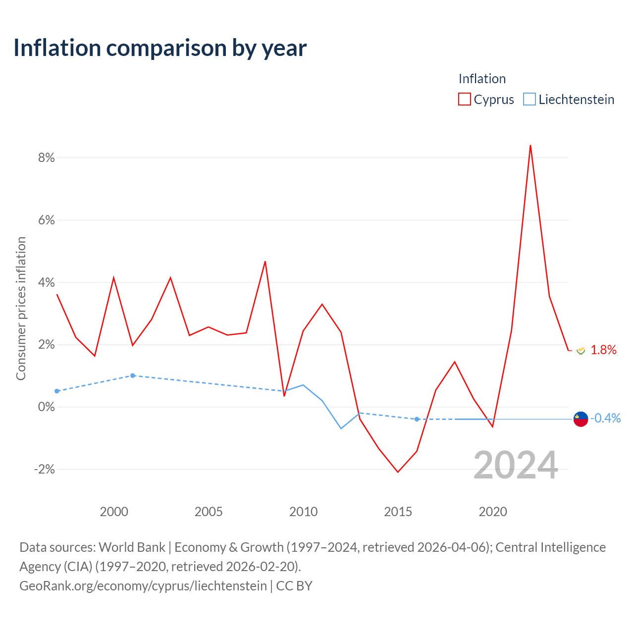 Over the past 24 years, Cyprus has recorded an average annual inflation rate of 1.64%, compared with 0.04% in Liechtenstein. In 2020, inflation was 1.8% in Cyprus and -0.4% in Liechtenstein.