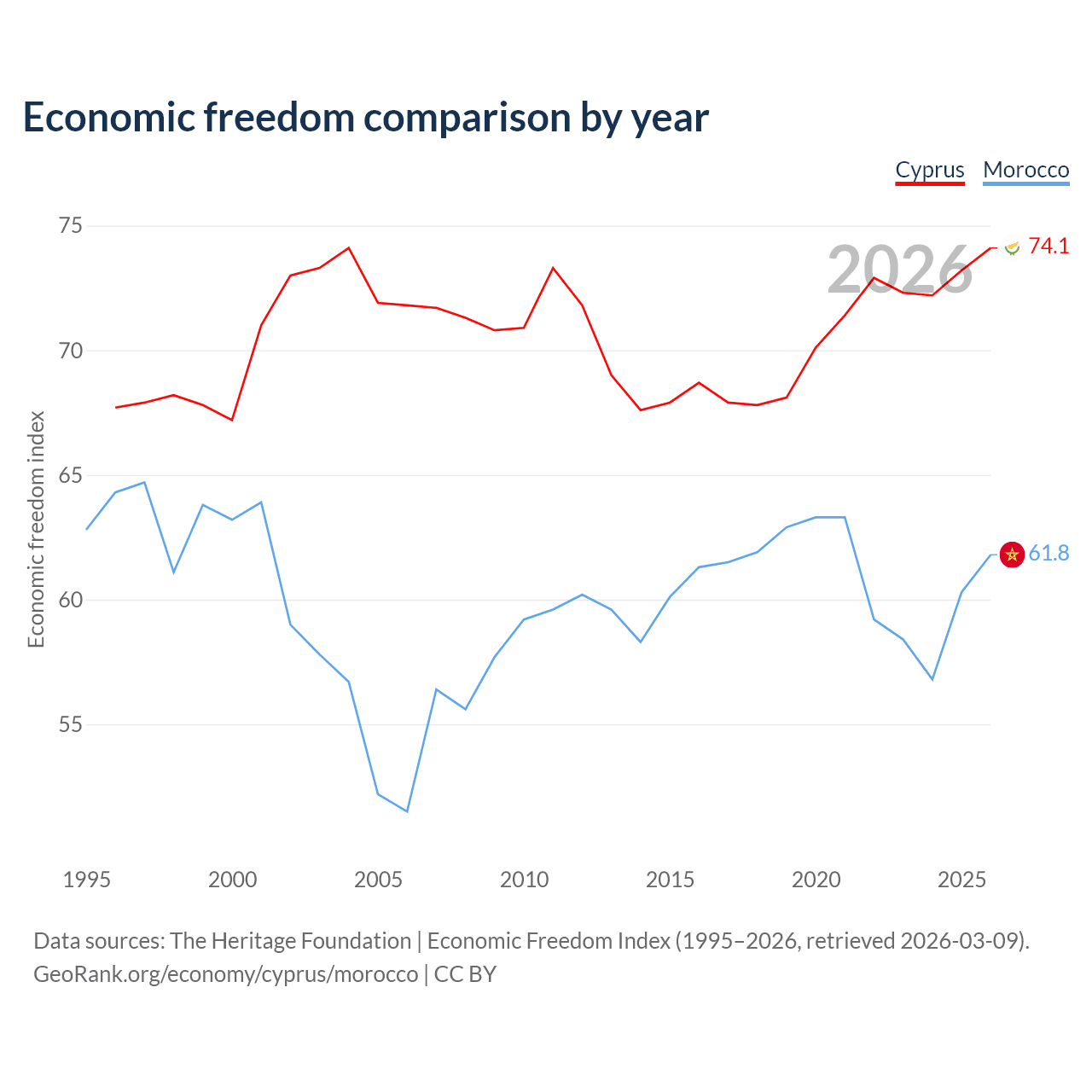 The Economic Freedom Index for Cyprus is 74.1, ranking 21/197, compared to 61.8 for Morocco, ranking 91/197. The chart above displays a comparison of annual changes in economic freedom indexes.