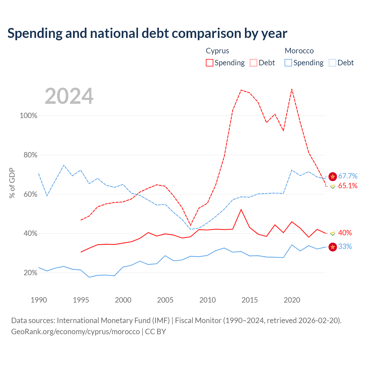 Cyprus has $24.5B in government debt (65.1% of GDP), compared to $109B (67.7% of GDP) in Morocco.