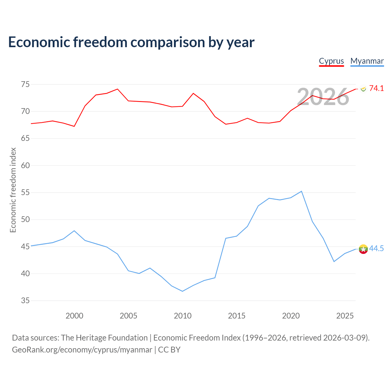 The Economic Freedom Index for Cyprus is 74.1, ranking 21/197, compared to 44.5 for Myanmar, ranking 180/197. The chart above displays a comparison of annual changes in economic freedom indexes.