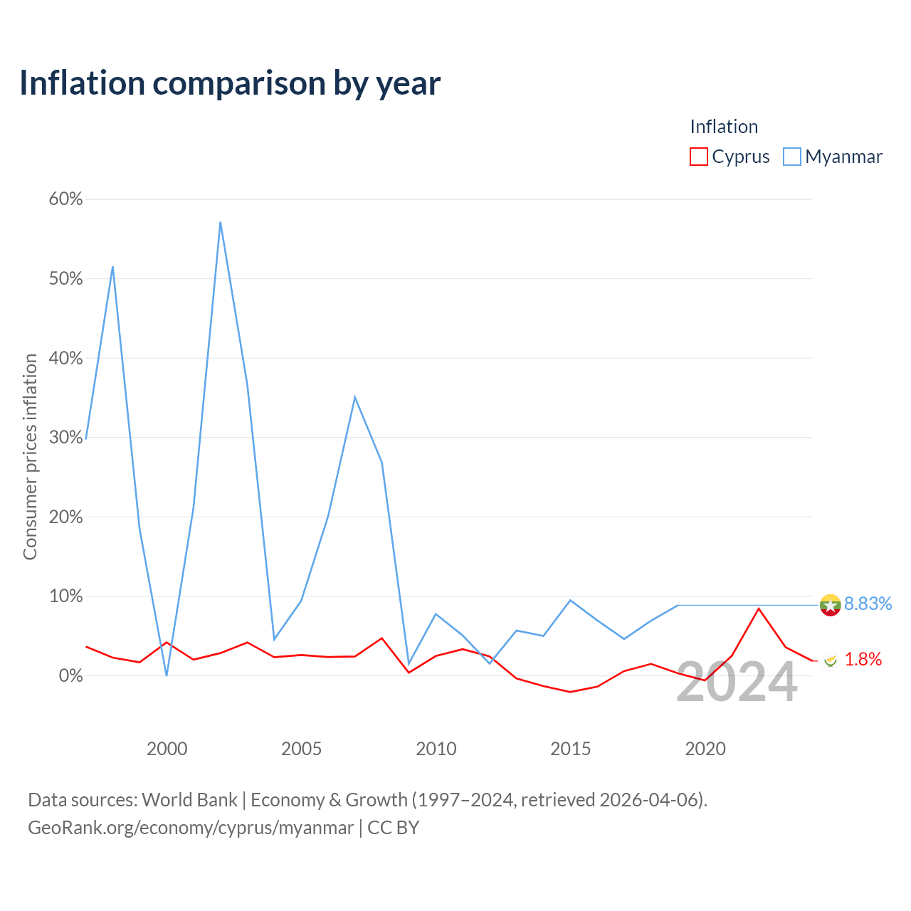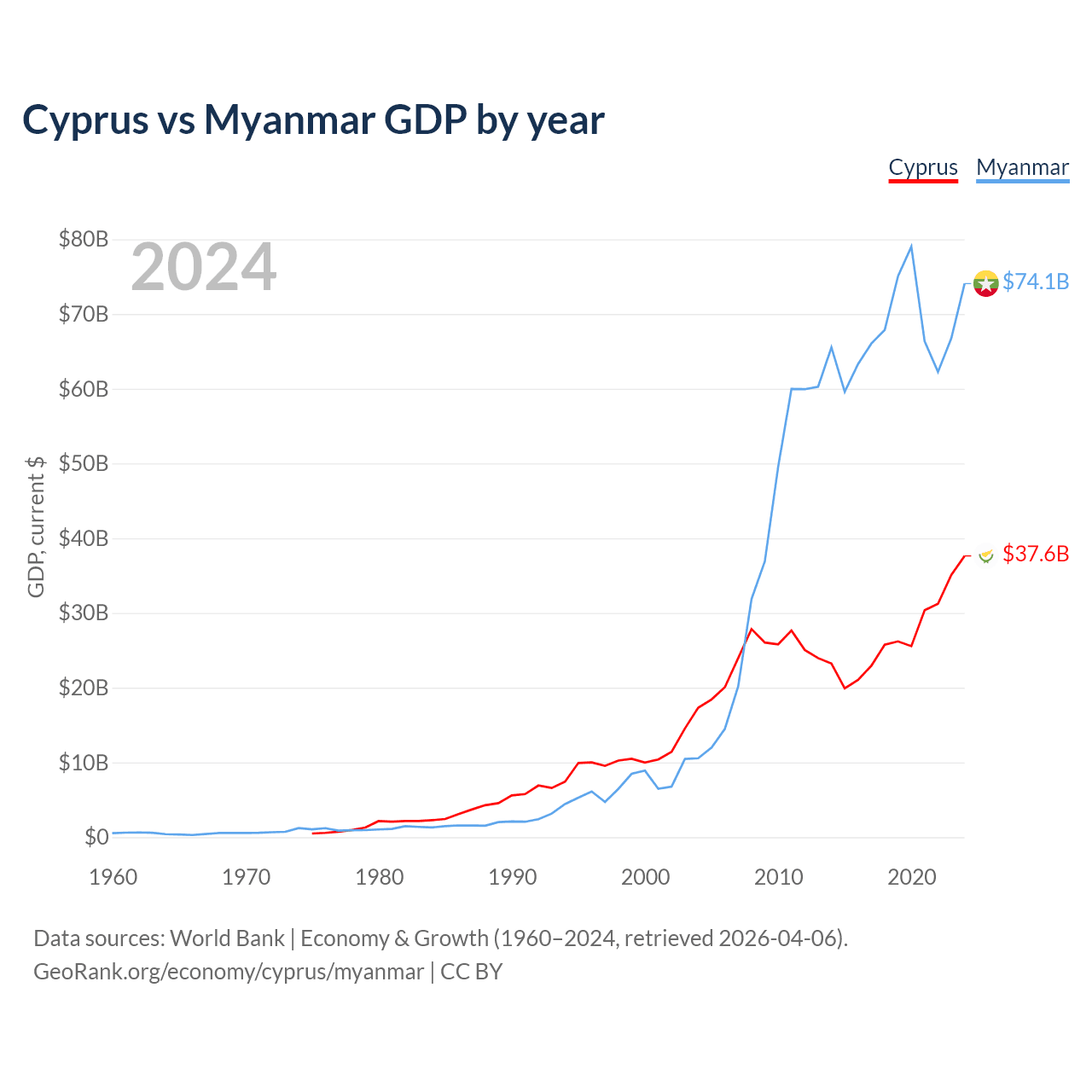 Cyprus has a GDP of $37.6B compared to $74.1B for Myanmar, ranking 103/197 and 85/197 by economy size, respectively.