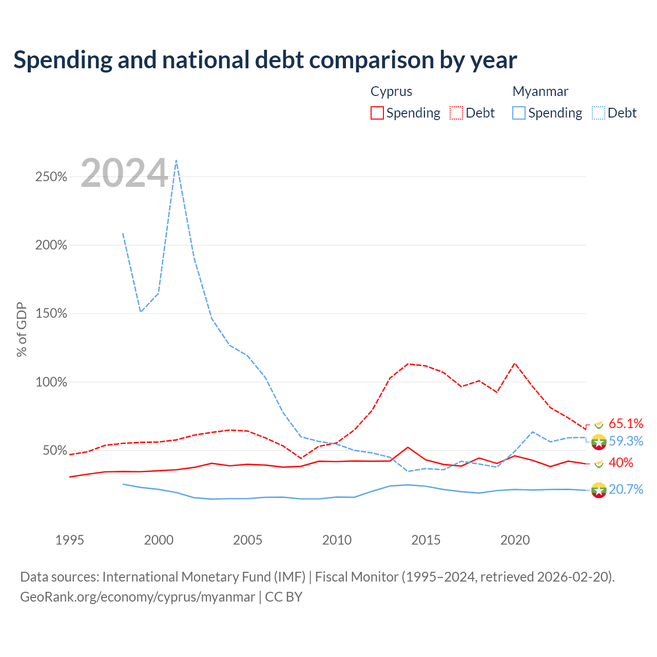 Cyprus has $24.5B in government debt (65.1% of GDP), compared to $44B (59.3% of GDP) in Myanmar.